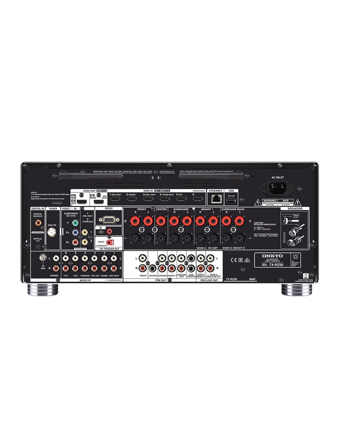 - 9x coppie di terminali d'uscita di potenza multicanale per diffusori con impedenze nominali comprese tra 4 e 16 Ohm, con facoltà di impiegare le uscite Height 1 e Surround Back per veicolare il segnale a stanze separate (Zone 2 e Zone 3) e/o per bi-amplificare i diffusori frontali e/o per canali addizionali Height 2;