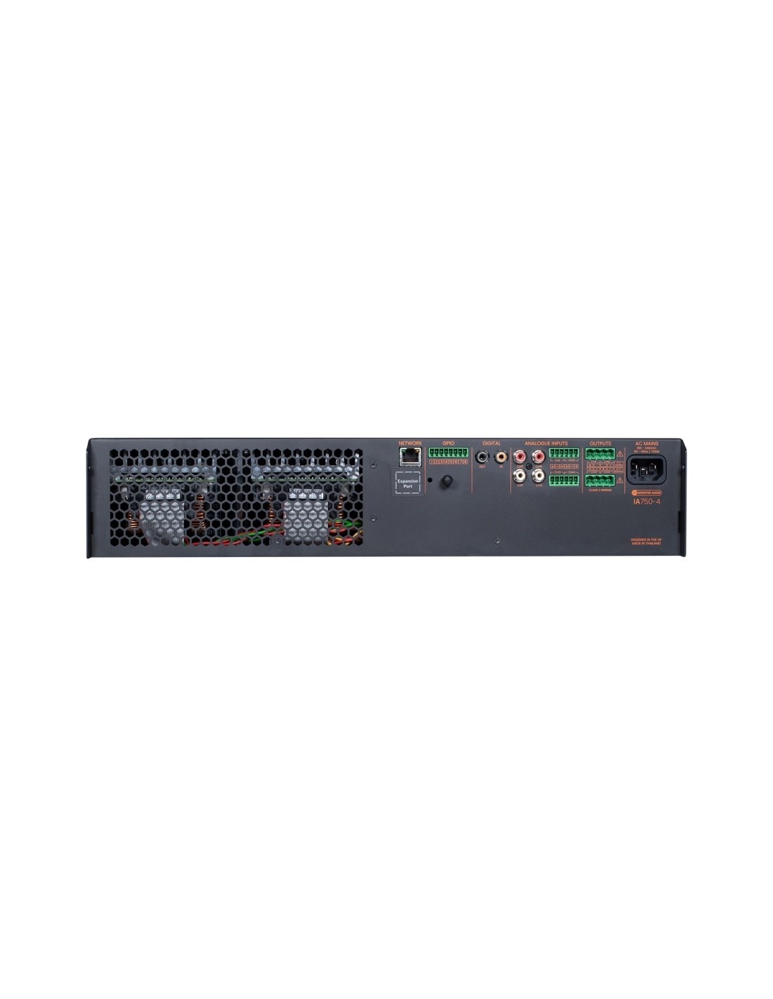 Amplificatore Custom Installation serie G2 a 4 canali basato su moduli in Classe D ultra performanti, con chassis in standard rack 2U - potenza massima erogabile (tutti i canali pilotati simultaneamente) 3000 Watt: 750 Watt per canale (4 canali) su 2/4 Ohm, 4x400 Watt su 8 Ohm, configurabile in modalità a ponte (potenza 2x1500 Watt su 4/8 Ohm), con facoltà di pilotare direttamente linee di diffusione a 70/100 Volt (2x1200 Watt a 70 Volt / 2x1500 Watt a 100 Volt) - DSP (Digital Signal Processor) a matrice completamente personalizzabile mediante interfaccia avanzata di setup e controllo TCP/IP multipiattaforma, ottimizzata per tablet e smartphone con risposta in tempo reale, grazie alla quale è possibile configurare un set evoluto di parametri e funzioni, tra cui: modalità di avvio/arresto con o senza delay; instradamento dei segnali audio tra i canali e gestione zone di controllo; modalità mono/stereo, livelli di trim, guadagno, volume, compressione, limiter, delay, equalizzazione parametrica, filtri crossover, FIR, polarità; caricamento e salvataggio preset - circuiti di protezione da cortocircuiti, sovraccarico, sottotensioni e surriscaldamento - alimentazione SMPS di elevata qualità con tecnologia PFC (Power Factor Correction) e tensioni d'esercizio universali (100 V - 240 V / 50 Hz - 60 Hz) - interfacce di rete ethernet RJ45 e Wi-Fi - morsettiere Euroblock per segnali bilanciati su ciascun canale con supporto livelli -10 dBV / +4 dBU / + 14 dBU / microfono - 4x ingressi linea analogici sbilanciati RCA - 1x ingresso e 1x uscita digitali coassiali elettrici RCA - interfaccia Euroblock GPIO (General Purpose In/Out) configurabile per la gestione da remoto del volume, dello standby, del Mute e delle funzioni Trigger - terminali per diffusori Phoenix con modalità Lo-Z a bassa impedenza (4/8 Ohm) e Hi-Z ad alta impedenza (70/110 V) - supporto completo e driver dedicati per integrazione con sistemi di domotica Crestron, Crestron Home, Control4, RTI - risposta in frequenza 20 Hz - 20 kHz (8 Ohm / -3 dB) - distorsione armonica totale <0,05% (THD + N, 8 Ohm / 20 Hz - 20 kHz / -3 dB) - rapporto segnale/rumore >108 dB (SNR, A-weighted / 20 Hz - 20 kHz, 8 Ohm) - staffe per il montaggio a rack incluse in dotazione - dimensioni chassis: (L x A x P) 440 x 88 x 329 mm