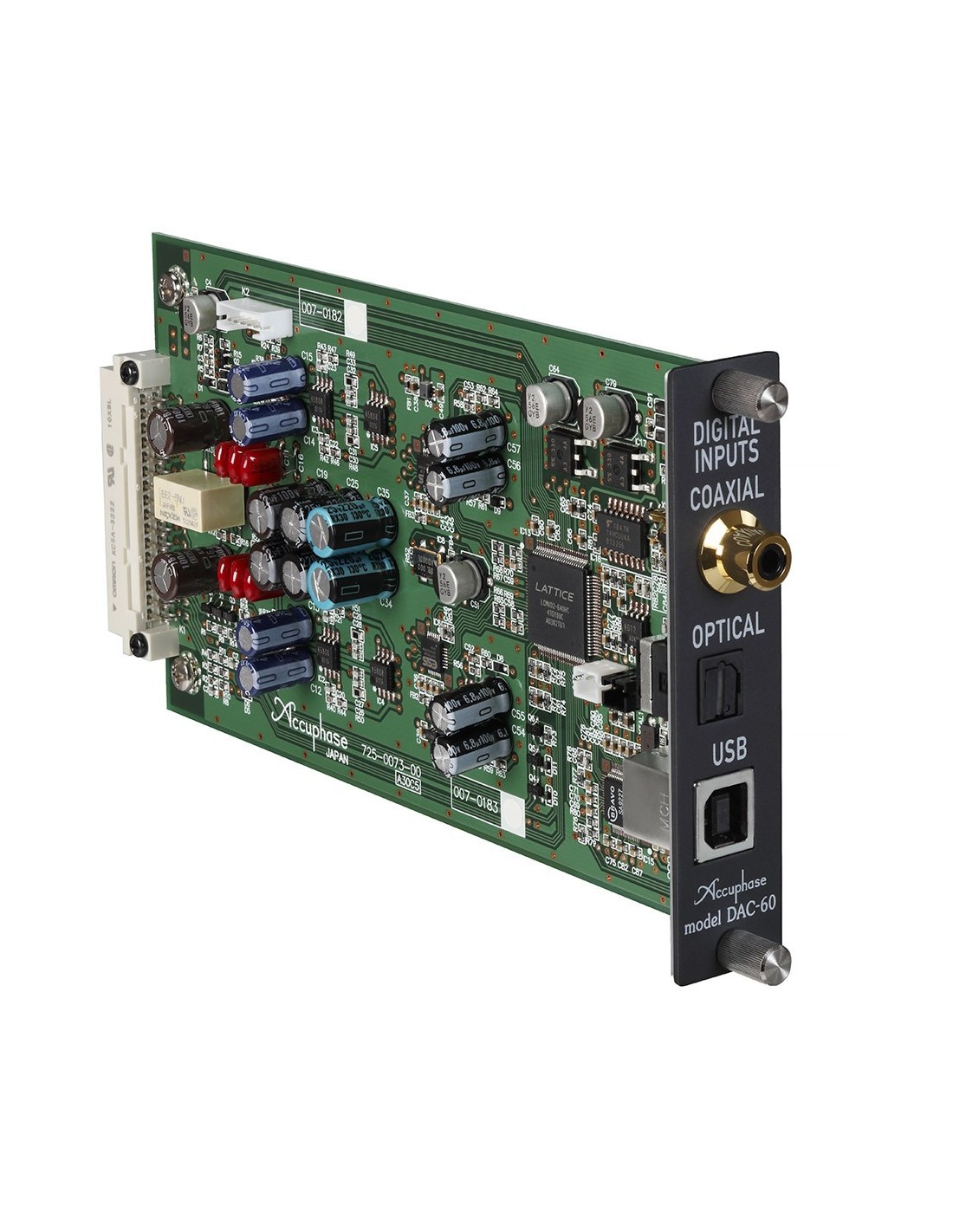 SCHEDA CONVERTITORE DIGITALE/ANALOGICO PER PREAMPLIFICATORI E AMPLIFICATORI INTEGRATI ACCUPHASE DOTATI DI SLOT DI ESPANSIONE - RIPRODUZIONE FORMATI NATIVI DSD (2.8224 MHZ, 5.6448 MHZ, 11.2896 MHZ) E PCM FINO A 32 BIT / 384 KHZ - STADIO DI CONVERSIONE D/A DOTATO DI TECNOLOGIA 2MDS+ (MULTIPLE DELTA-SIGMA), CON COPPIA DI DAC CHIP ESS TECHNOLOGY ES9016K2M MONTATI IN PARALLELO - INGRESSI DIGITALI: 1X USB TYPE B, 1X COASSIALE ELETTRICO S/PDIF RCA, 1X OTTICO TOSLINK - COMPATIBILE CON LE ELETTRONICHE ACCUPHASE DI ULTIMA GENERAZIONE (ELENCO AGGIORNABILE) C-2150, E-800, E-650, E-480, E-380, E-280 E, CON ALCUNE FUNZIONI SECONDARIE PARZIALMENTE RIDOTTE CHE NON INFLUENZANO LA QUALITA' DI RIPRODUZIONE DELLA SCHEDA NE' IL COMPLESSO DEI FORMATI RIPRODUCIBILI, CON I SEGUENTI PRODOTTI: C-2120, C-2110, C-2000, C-245, CX-260, E-600, E-560, E-550, E-530, E-470, E-460, E-450, E-408, E-370, E-360, E-350, E-308, E-307, E-270, E-260, E-250, E-213