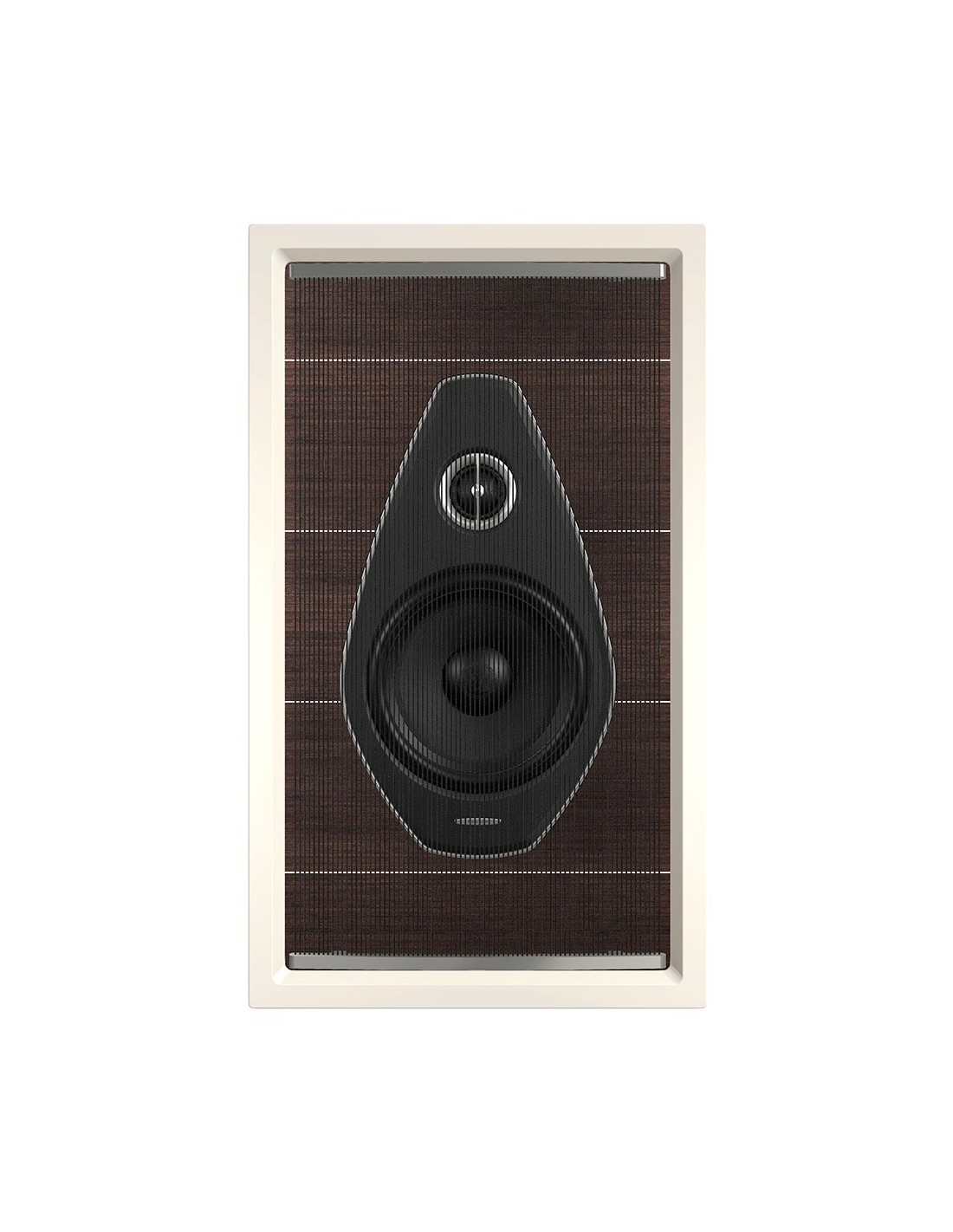 KIT ESCLUSIVO DEDICATO AL DIFFUSORE DA INCASSO A PARETE PALLADIO LEVEL 6 PW-662, DAL DESIGN PENSATO PER ARREDARE PIUTTOSTO CHE PER "SCOMPARIRE", COMPOSTO DA UN PANNELLO FRONTALE IN LEGNO DI NOCE NATURALE CON INTARSI IN ACERO FATTI A MANO, DALLE ICONICHE MASCHERINE SONUS FABER CON FILI ELASTICI E DA UNA CORNICE MAGNETICA VERNICIABILE - FINITURA WENGE