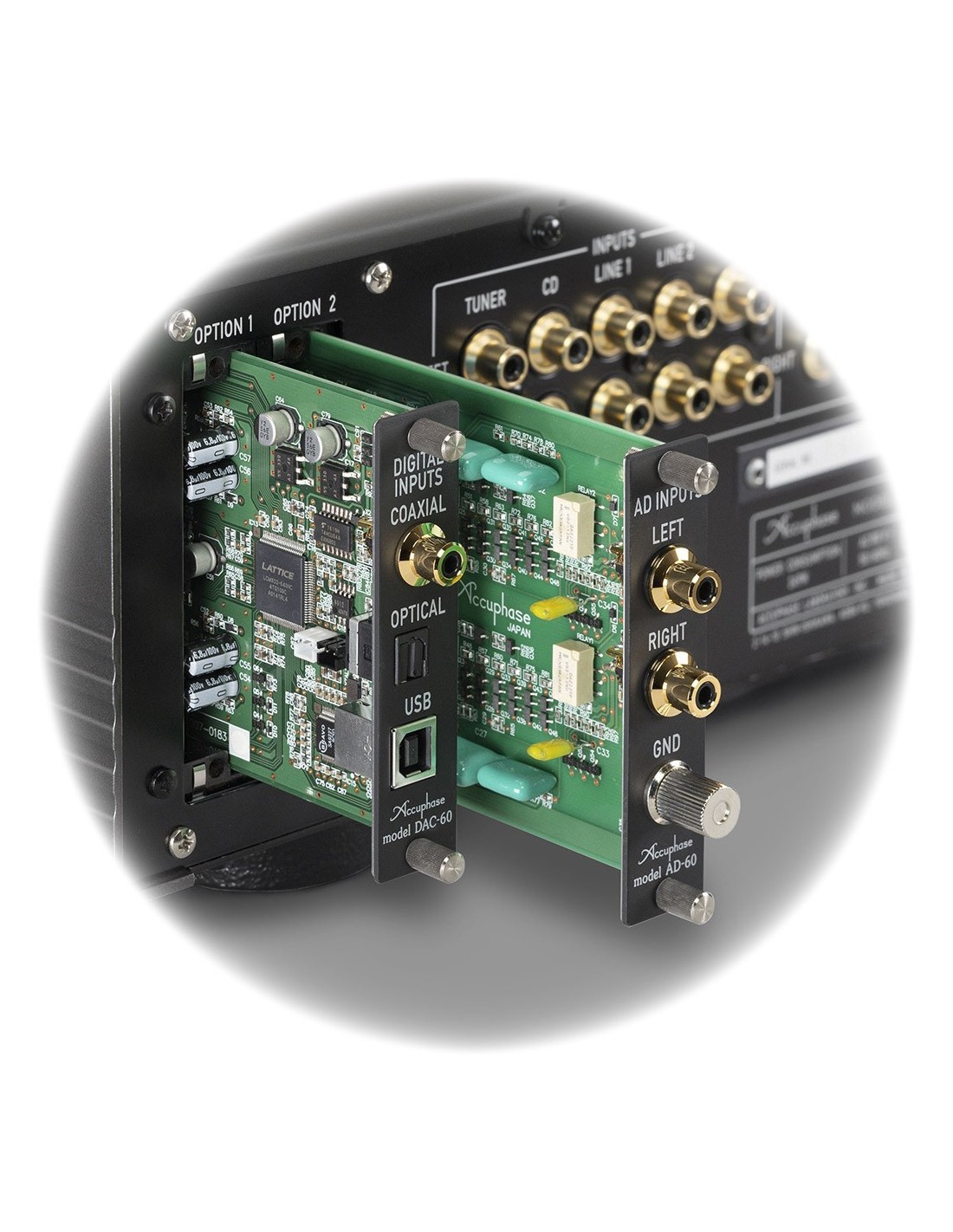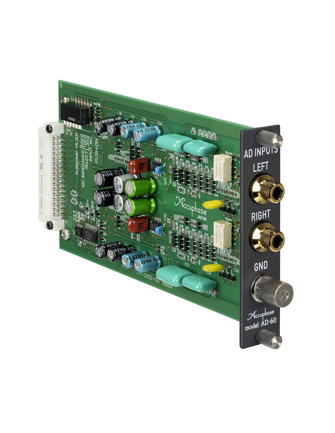 - compatibile con le seguenti elettroniche Accuphase (lista aggiornabile e da estendere alle elettroniche di generazione successiva ai modelli elencati): C2300 (tutte le regolazioni accessibili direttamente tramite i pulsanti di comando pre-allocati sul pannello frontale) / C-2150, C-2120, C-2110, E-800, E-5000, E-650, E-600, E-560, E-550, E-4000, E-480, E-470, E-460, E-450, E-380, E-370, E-360, E-350, E-280, E-270, E-260, E-250 (selezione MM/MC pre-allocata sul pannello frontale dell'elettronica, regolazioni di carico e filtro subsonico da operare tramite i DIP Switch presenti sulla scheda AD-60) / C-2000, C-265, C-245, CX-260, E-530, E-408, E-407, E-406V, E-308, E-307, E-306V, E-213, E-212, E-211 (tutte le regolazioni da operare tramite i DIP Switch presenti sulla scheda AD-60).