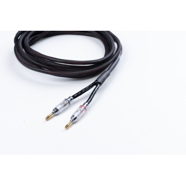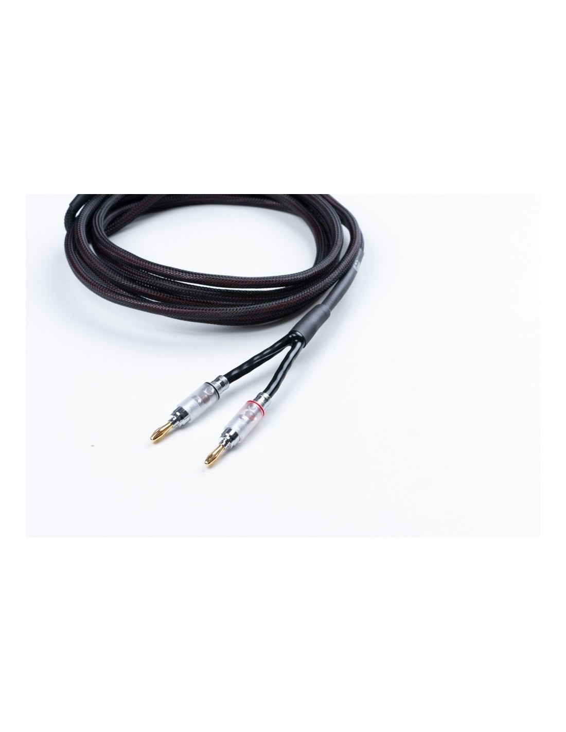 Cavo di collegamento per diffusori. Conduttori in rame rigido OFC 99.99%, 4x0,75mm2. Connettori a banana in bronzo/fosforo dorati con diametro 4mm. Guaina esterna trasparente in PVC con calza intrecciata nera.