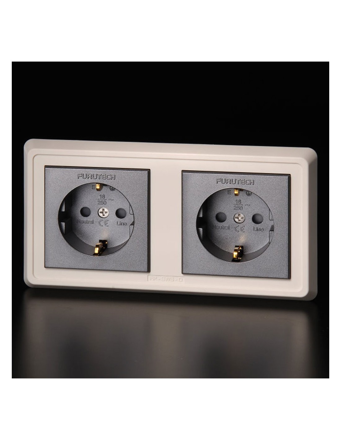 Doppia presa Schuko ad alta conduttività da muro - corpo in nylon/fiberglass e policarbonato - connettori in rame massiccio placcato oro - pannello frontale in zinco/magnesio ricoperto in ABS - contatti ad alta pressione in attesa di brevetto (PAF) - dimensioni: 152 x 81 x 48 mm (L x A x P)