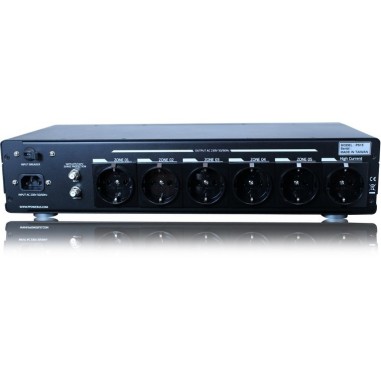 6-zone Schuko Network Conditioner with sequential on/off. Protects against RFI/EMI, overvoltage, undervoltage. Controlled by Renesas Microprocessor.