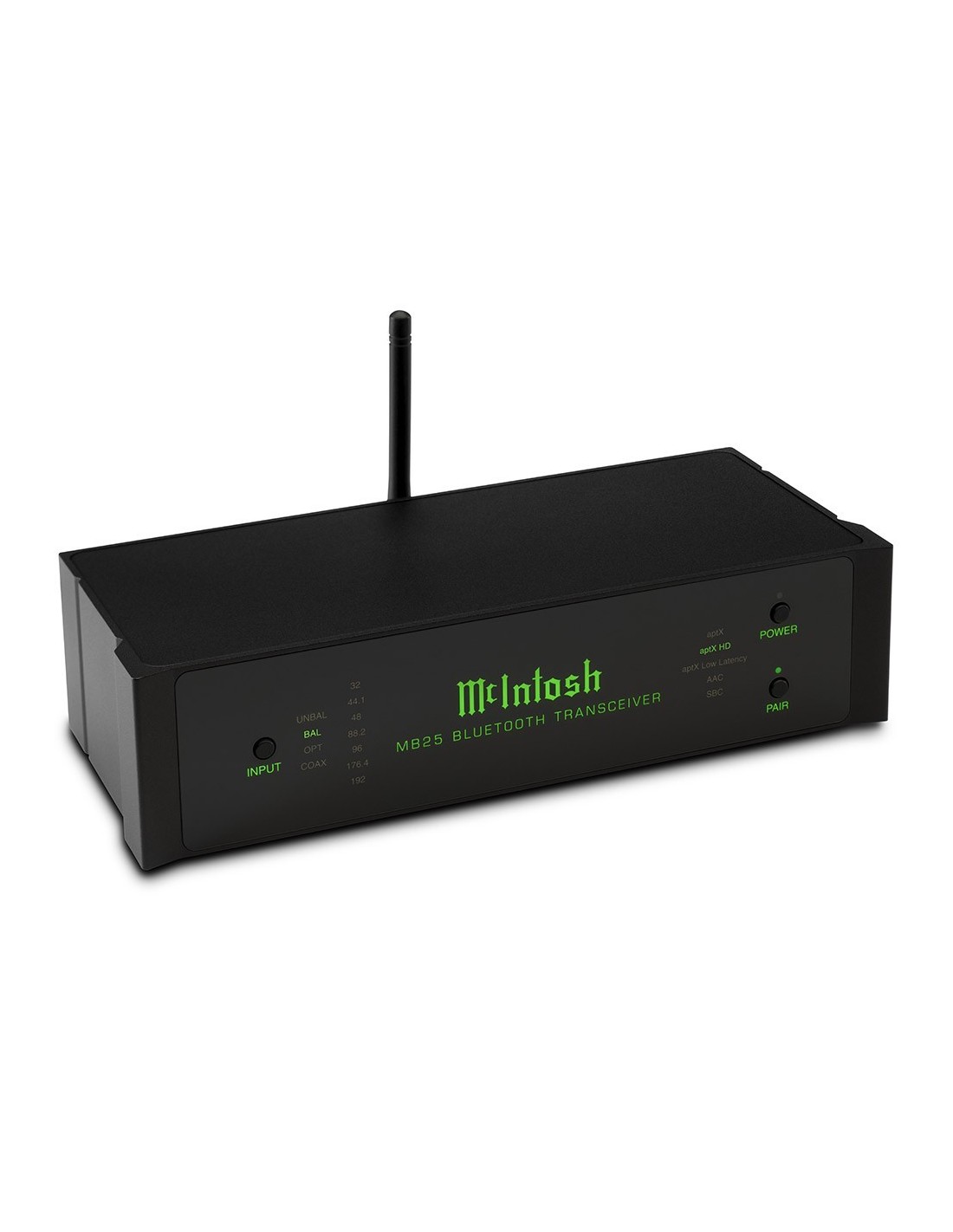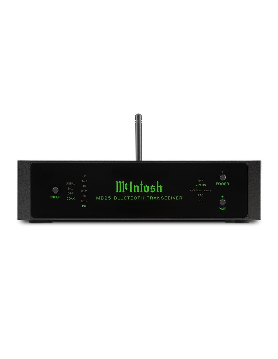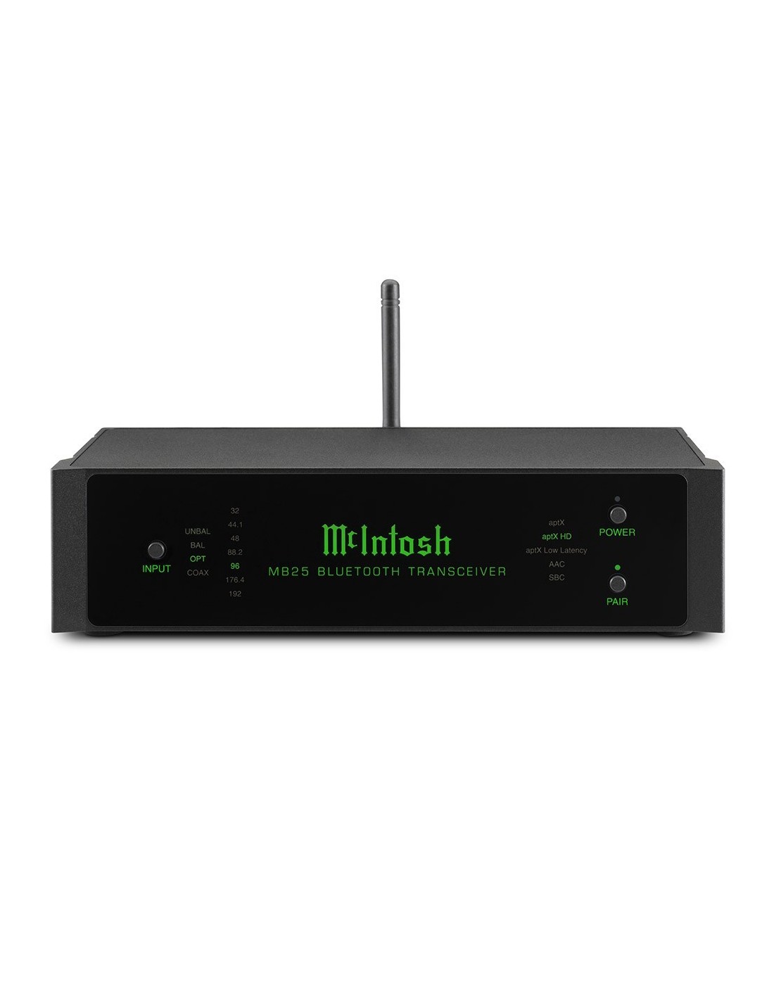 - chassis in alluminio, pannello frontale in vetro retroilluminato con indicazioni relative all'ingresso impiegato e alle caratteristiche del flusso audio in ricezione (campionamento e codec BT), con pulsanti di alimentazione, selezione ingresso e pairing;