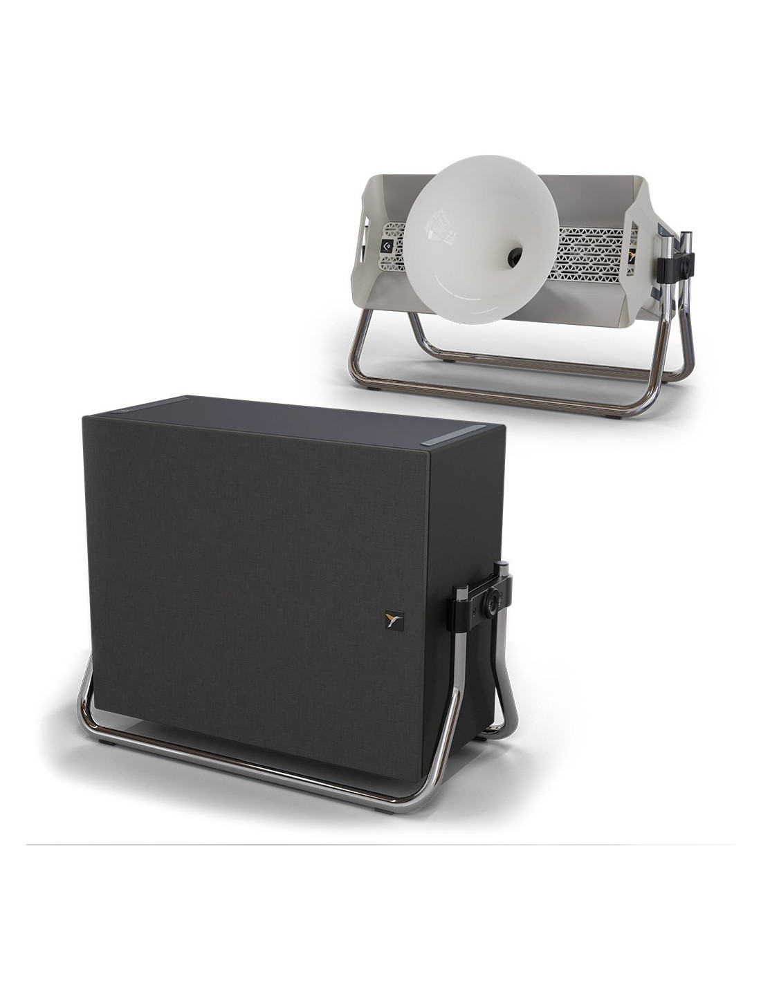 Stand Nest dedicato al collocamento tradizionale a pavimento sia del diffusore Colibri C2 con orientamento orizzontale, per l'impiego come canale centrale, sia del subwoofer Colibri Sub C18;