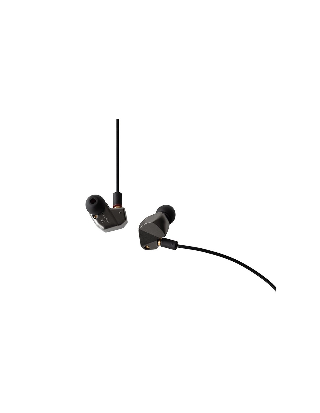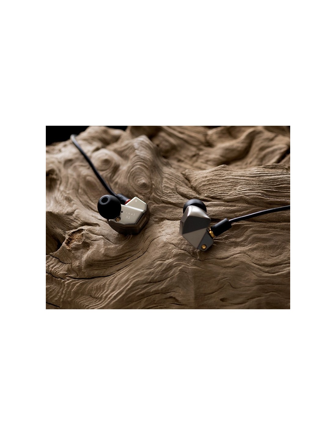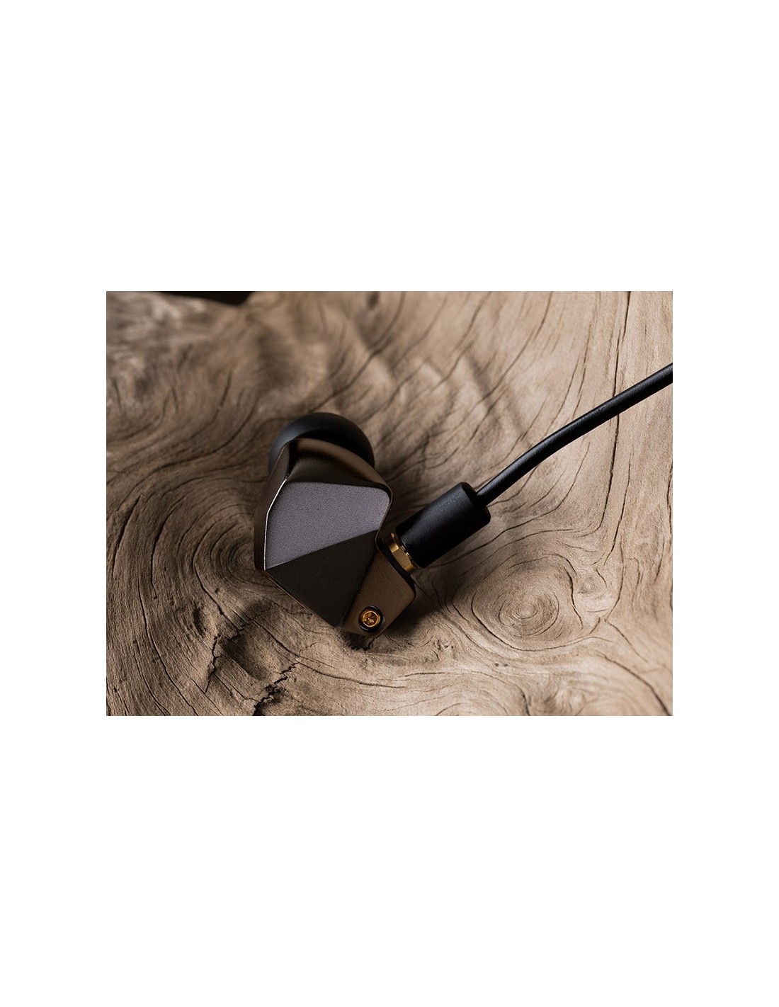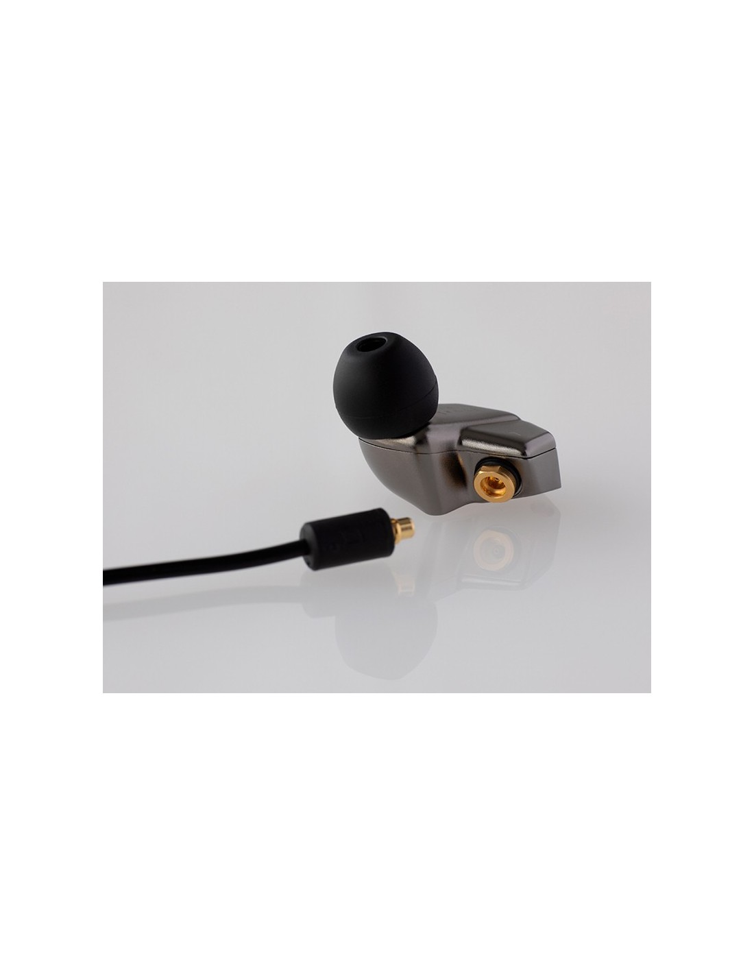 Cuffia In-Ear. Design con altoparlante fullrange ad armatura bilanciata (BA). Housing in acciaio inossidabile MIM (Metal Injection Molding) dalla forma studiata per ottimizzare la pressione dell'aria a vantaggio del suono. Design audiophile. 5 tipi di auricolari in silicone in dotazione. Cavo in rame OFC da 1,2m staccabile con connettori MMCX. Ganci in silicone per una ritenzione migliore. Custodia in silicone per il trasporto. Costruzione modulare per facilitare le possibili riparazioni. Impedenza 41 ohm. 109dB. Peso: 32gr. Particolare finitura in acciaio inossidabile colore Gunmetal Silver.