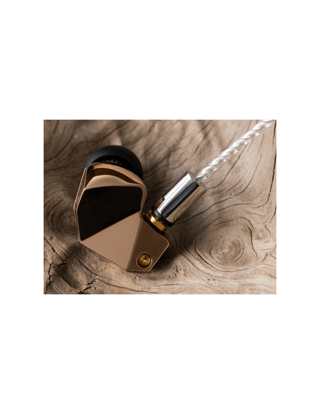 Cuffia In-Ear. Design a 2 vie, con altoparlante dinamico per i medio/bassi da 6,4mm e tweeter separato ad armatura bilanciata (BA) e senza utilizzo di crossover. Housing in acciaio inossidabile MIM (Metal Injection Molding) dalla forma studiata per ottimizzare la pressione dell'aria a vantaggio del suono. Design audiophile. 5 tipi di auricolari in silicone in dotazione. Cavo in rame OFC argentato da 1,2m staccabile con connettori MMCX. Ganci in silicone per una ritenzione migliore. Custodia in silicone per il trasporto. Costruzione modulare per facilitare le possibili riparazioni. Impedenza 13 ohm. 94dB. Peso: 36gr. Particolare finitura in acciaio inossidabile colore Rose Gold.