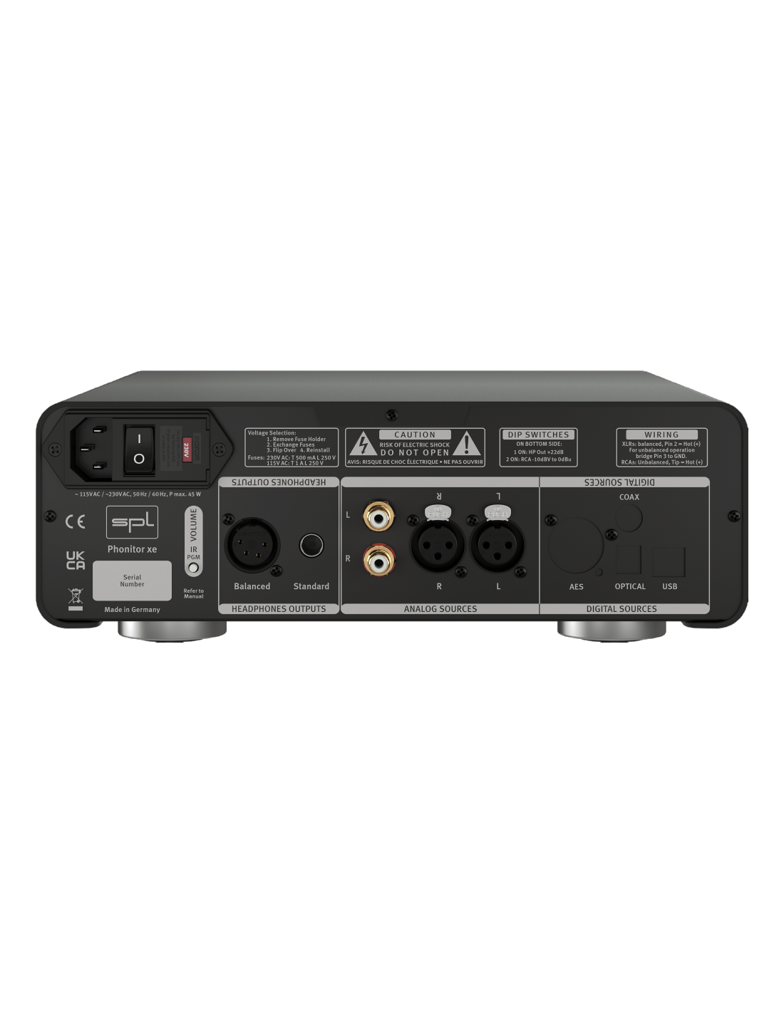 Amplificatore per cuffie con tecnologia VOLTAiR. Uscita sia per cuffie tradizionali con jack da 6,3mm che per quelle bilanciate con connettore a 4 poli XLR, raddoppiate sia sul frontale che sul retro dell'apparecchio. Potenza dell'uscita cuffia 2x8Watt. Potenziometro del volume motorizzato Alps RK27 Big Blue. Vu-meter con look retrò per visualizzare il livello dei segnali di ingresso destro e sinistro. 2 ingressi analogici, 1 XLR e 1 RCA. Uscita analogica XLR e RCA. Effetto matrix per simulare in cuffia l'ascolto con i diffusori. Bilanciamento dei canali e tasto stereo/mono. Tecnologia VOLTAiR +/-60V con amplificatori operazionali a discreti proprietari. Trasformatore toroidale schermato. Selezione delle sorgenti e regolazione del volume tramite qualsiasi telecomando ad infrarossi dopo apprendimento. Trigger 12V. Dimensioni (LxHxP): 278x100x330mm. Peso: 4,7Kg.