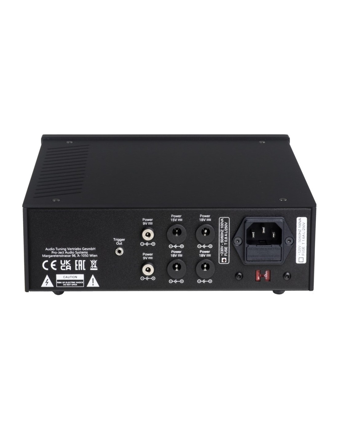 Stadio di alimentazione lineare, dedicato a tutti i componenti delle Serie Box Design (esclusi gli amplificatori integrati e i finali di potenza). 6 uscite: 2x9V, 3x18V e 1x15V (Giradischi). Sostituisce l'alimentatore di serie migliorandone drasticamente la qualità, la linearità e l'immagine sonora. Soft start. Trasformatore dedicato audio con isolamento in rame. Condensatori a bassa resistenza ESR da 10.000uF. Chassis in robusto alluminio per isolamento da interferenze. Dimensioni (LxAxP): 206x71x209mm.