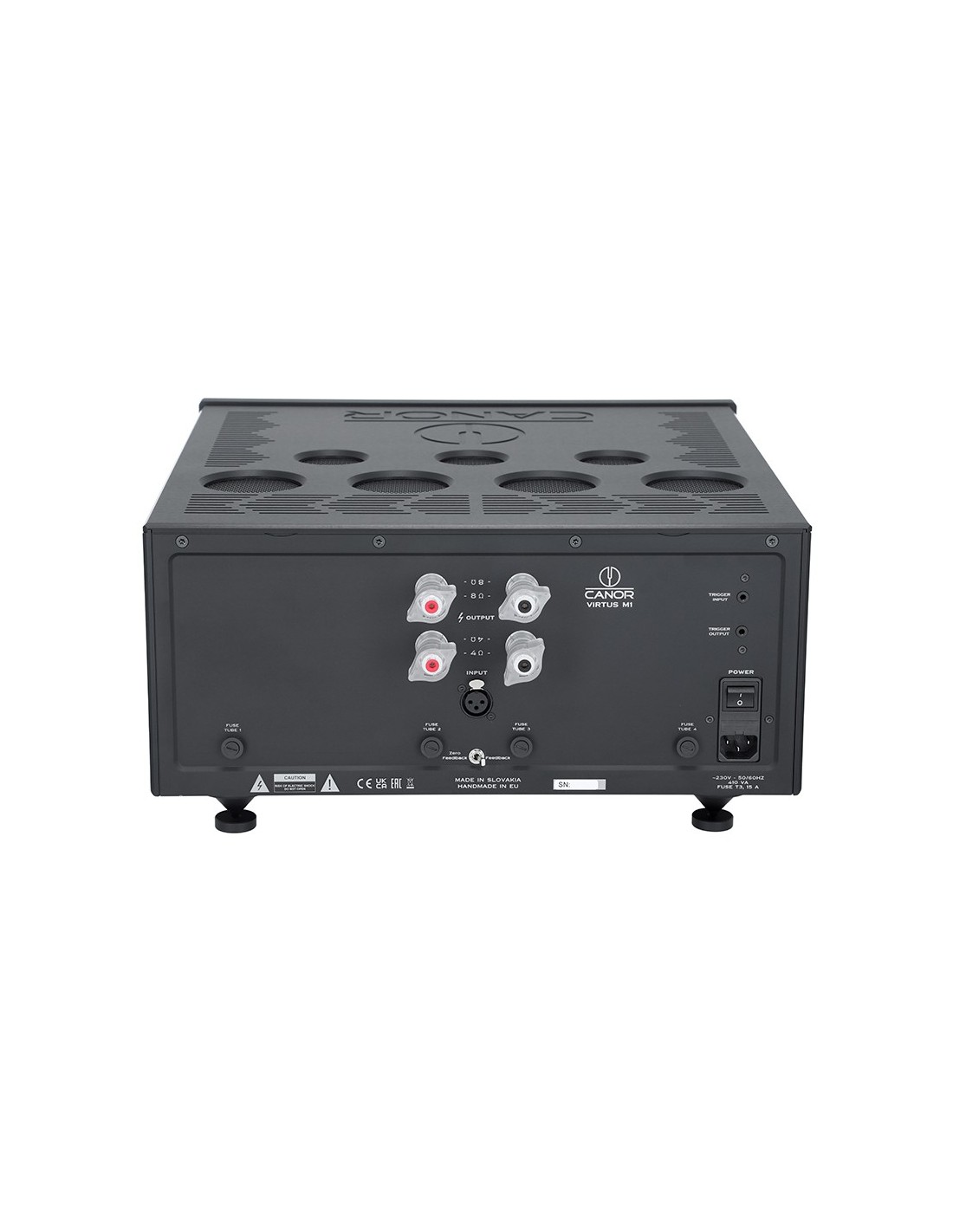 Finale di potenza mono a valvole in classe A. Potenza 55W su 4/8 ohm in configurazione a triodo e 110W su 8 ohm in configurazione lineare. Distorsione armonica bassissima 0,011% a 5W. Possibilità di commutare il funzionamento tra feedback e zero feedback con deviatore superiore. Lo stadio di alimentazione impiega un trasformatore custom incapsulato all'interno di un contenitore riempito con materiale composito anti-vibrazione. Trasformatori d'uscita in permalloy custom. Sul percorso del segnale sono impiegati solo i migliori condensatori in polipropilene. Condensatori di filtro nello stadio di alimentazione da 3900uF/550V. Valvole impiegate: 4x KT150, 2x ECC82, 1x 12AX7 selezionate maniacalmente. 1 ingresso XLR. Trigger In/Out. Chassis in solido alluminio per eliminare le vibrazioni. Dimensioni (LxAxP): 450x190x465mm. Peso: 40Kg