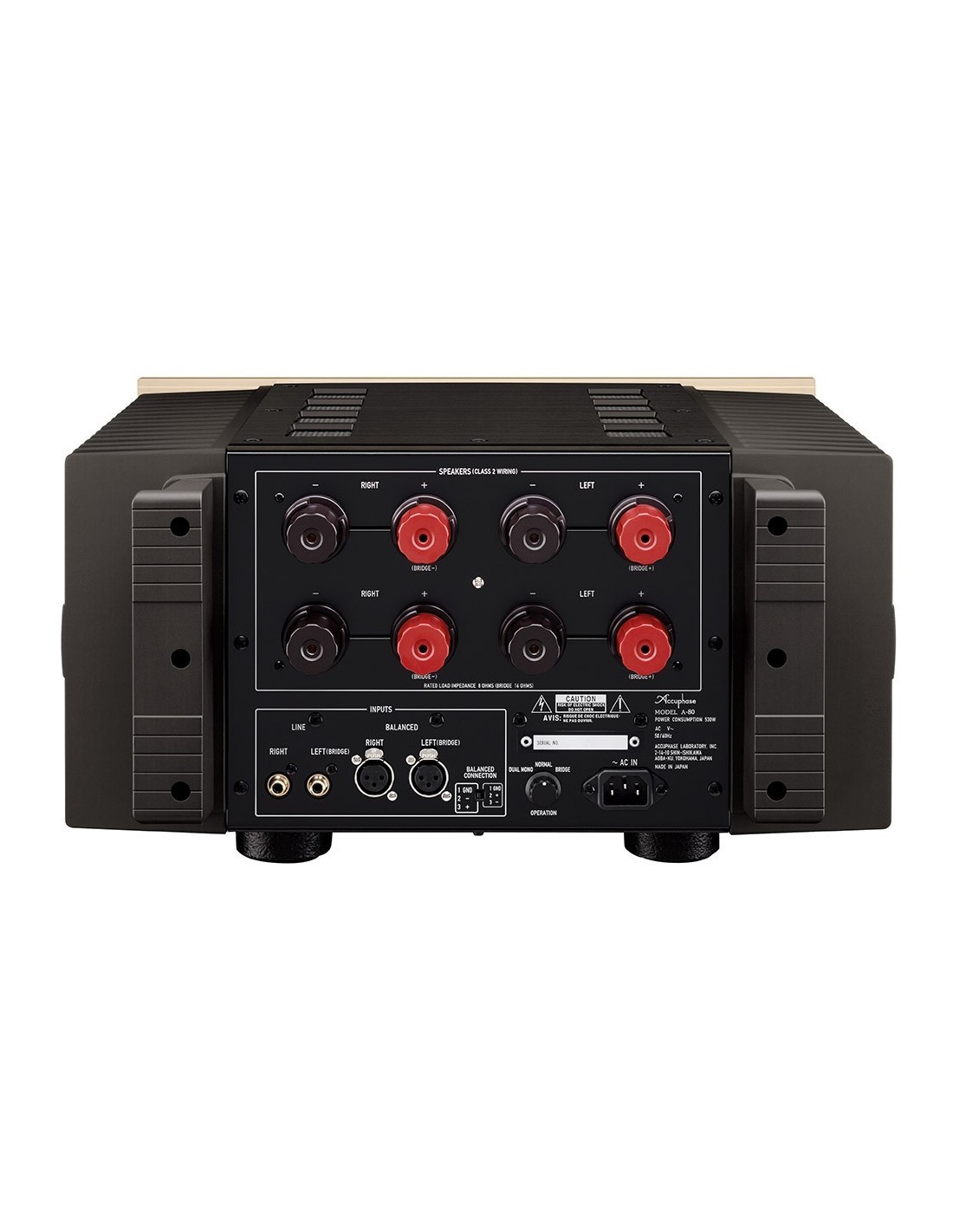 Amplificatore finale di potenza stereofonico a stato solido in pura Classe A completamente bilanciato - potenza 60 Watt per canale su 8 Ohm, 120 Watt su 4 Ohm, 240 Watt su 2 Ohm, 480 Watt su 1 Ohm - possibilità di configurazione a ponte monofonica per una potenza totale di 240 Watt su 8 Ohm, 480 Watt su 4 Ohm, 960 Watt su 2 Ohm - 10 MOS-FET di potenza in configurazione push-pull parallela - stadio di amplificazione con tecnologia MCS+ - percorsi di segnale interamente realizzati con semiconduttori a componenti discreti - stadio d'ingresso e d'uscita Current Feedback con tecnologia Balanced Remote Sensing a bassissima impedenza, con strabiliante Damping Factor superiore a 1000 - stadio d'alimentazione con imponente trasformatore toroidale ad alta efficienza e condensatori di filtro d'elevata capacità - guadagno variabile a 4 posizioni (Max/-3/-6/-12 dB) - circuito di protezione a semiconduttori MOS-FET certificati per altissime tensioni d'esercizio - selettore di fase per invertire i pin 2 e 3 della connessione bilanciata XLR - Peak Output Power Meter digitali - doppio set di terminali per diffusori sovradimensionati - distorsione armonica totale (THD) 0,03% da 4 a 16 Ohm - distorsione di intermodulazione 0,01% - rapporto segnale/rumore (S/N Ratio) fino a 133 dB - dimensioni (L x A x P) 465 x 238 x 515 mm - Peso 44 Kg