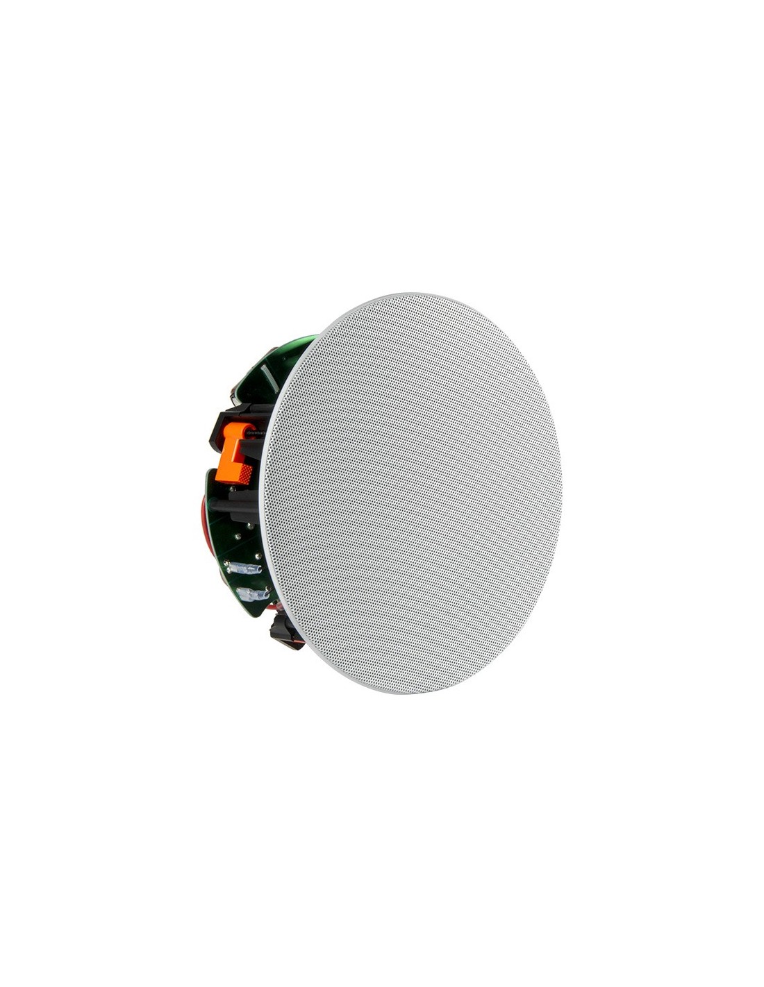 Diffusore da incasso a soffitto di forma rotonda, 2 vie, 1 tweeter a cupola in alluminio da 25mm con lente acustica, 1 Bass/Midrange da 165mm con cono in Policellulosa, 87dB, 20-100W, 8 ohms, ampia dispersione sonora, diametro incasso 203mm, profondità di montaggio 101mm, semplice installazione con XL-2 Bracket, griglia magnetica e finitura bianca verniciabile, si integrano perfettamente a filo muro, costruzione accurata anti-vibrazioni.