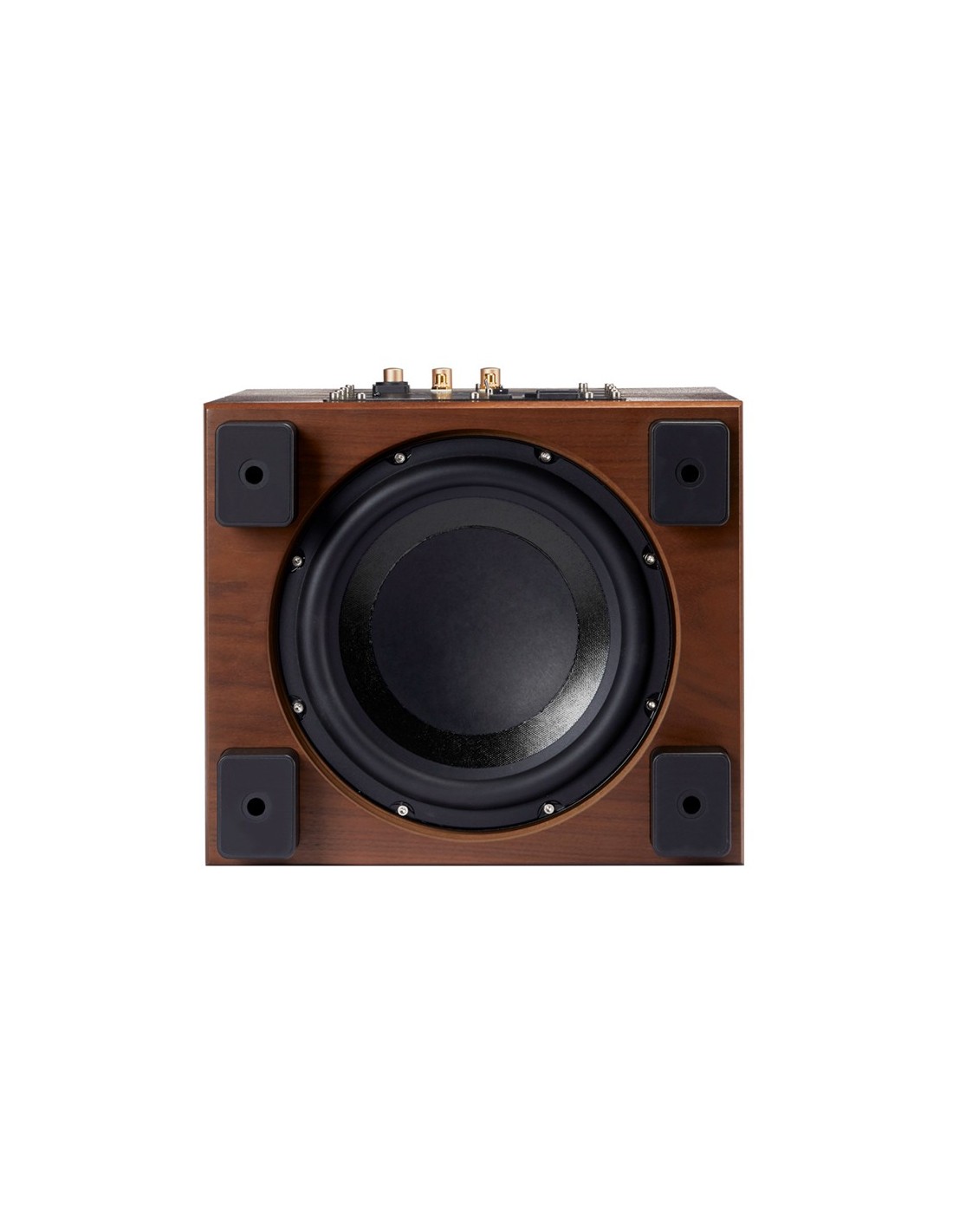 Subwoofer amplificato in sospensione pneumatica dal look vintage. Woofer a lunga escursione da 25cm con cono in cellulosa a cupola invertita e cestello in acciaio. Emissione a pavimento. Potenza 300W in classe D. Regolazione del volume e della frequenza di taglio del xover. Fase 0-180°. Possibilità di renderlo wireless attraverso gli adattatori esterni opzionali AirShip II o HT Air MKII Wireless. Ingressi: stereo RCA, LFE RCA separato e Neutrik ad alto livello. Dimensioni del cabinet (LxAxP): 35x47x29,8cm. Finitura vintage in legno di noce con venature.