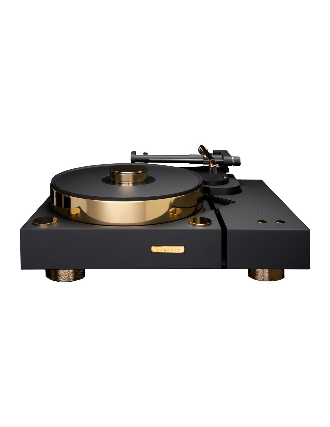 Giradischi di riferimento del catalogo Bergmann con base in alluminio, piatto in alluminio e acrilico su cuscino d'aria, perno in acciaio e cuscinetto in polimeri a bassa frizione. Disponibile in versione base con basetta e sistema silenzioso di pompaggio aria, o con braccio tangenziale su aria Odin. Base in finitura nera e parti metalliche argento, può montare fino a quattro bracci.