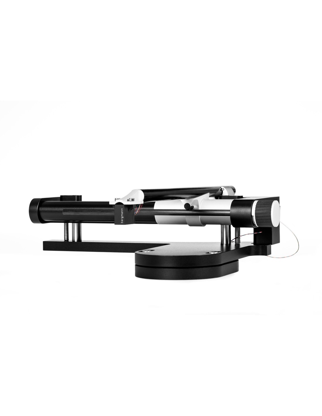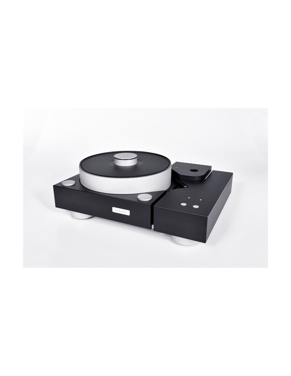 Giradischi di riferimento del catalogo Bergmann con base in alluminio, piatto in alluminio e acrilico su cuscino d'aria, perno in acciaio e cuscinetto in polimeri a bassa frizione. Versione con sistema silenzioso di pompaggio aria e braccio tangenziale su aria Odin. Base in finitura nera e parti metalliche argento, può montare fino a quattro bracci.