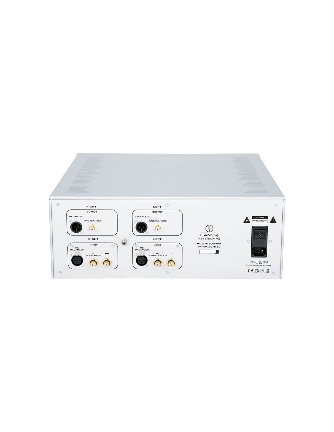 Stadio Phono MM/MC a valvole bilanciato. Circuitazione Zero feedback e completamente bilanciata (True Balanced). L'ingresso MC ha lo step-up interno con trasformatore Lundahl. Impedenza e capacità variabili tramite manopola frontale. Lo stadio di alimentazione impiega un trasformatore custom dove primario e secondario sono separati galvanicamente da un foglio di rame e il tutto incapsulato all'interno di un contenitore riempito con materiale composito anti-vibrazione. Sul percorso del segnale sono impiegati solo i migliori condensatori in polipropilene. Design dei circuiti stampati proprietario CMT technology. Tutte le valvole impiegate sono meticolosamente selezionate e sono: 8 x 6922EH, 1 x 6CA4EH selezionate maniacalmente. 1 ingresso MM RCA e 2 ingressi MC (1 RCA e 1 XLR). 2 Uscite (1 RCA e 1 XLR). Chassis in solido alluminio per eliminare le vibrazioni. Display grafico a matrice di punti. Dimensioni (LxAxP): 435x170x485mm. Peso: 18Kg.