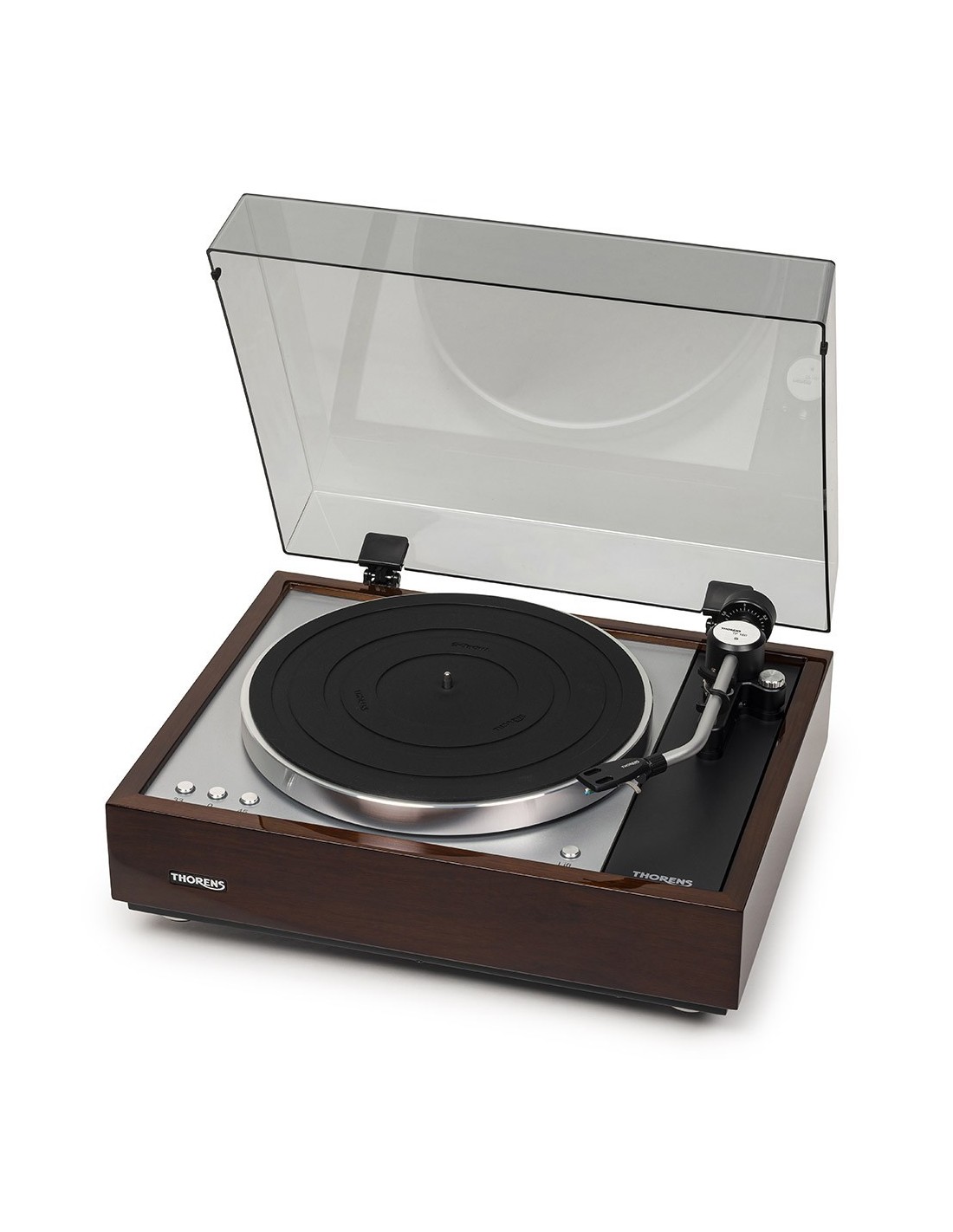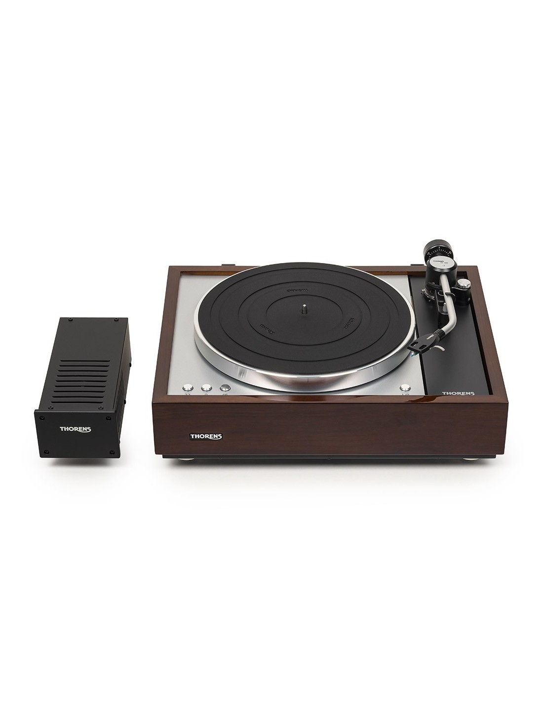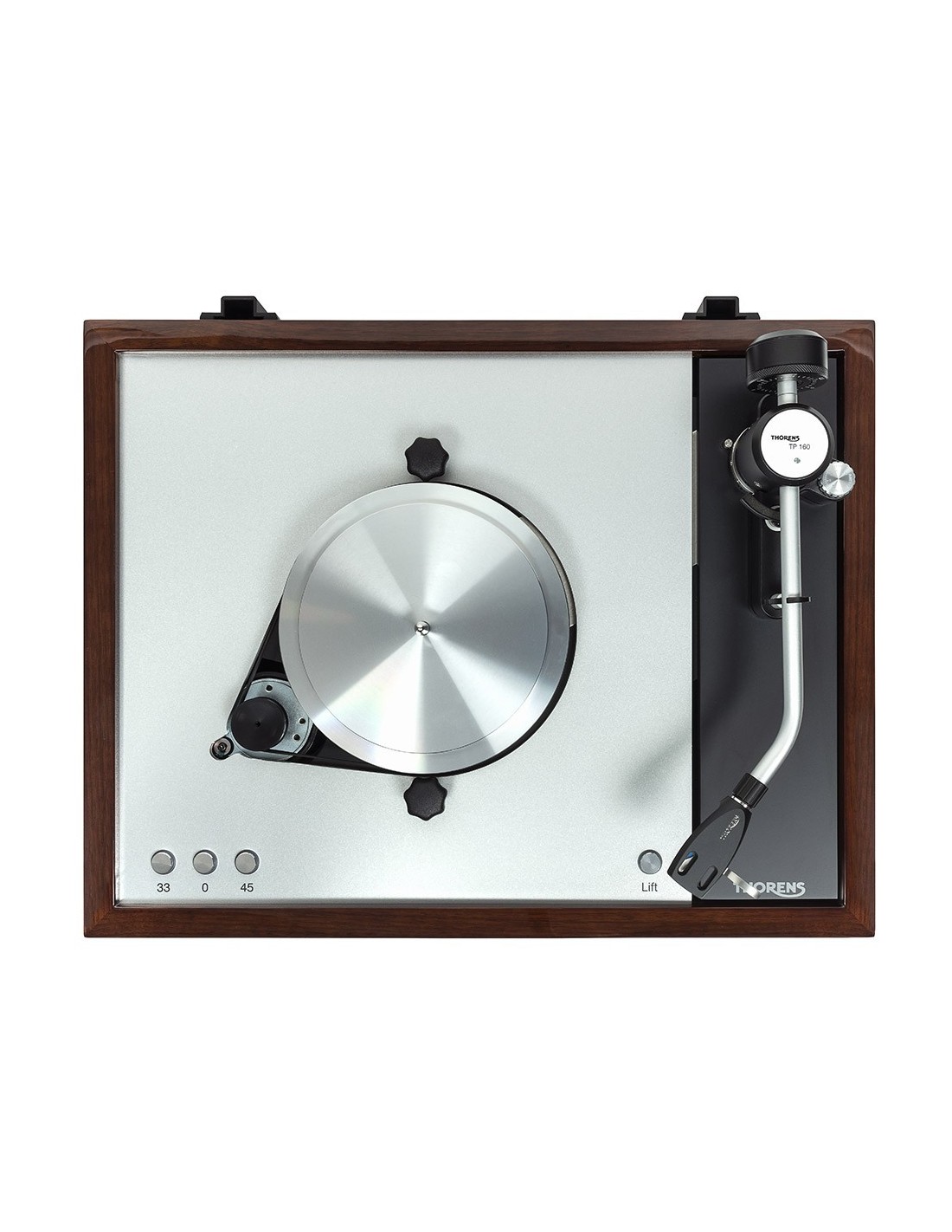 Giradischi a telaio sospeso flottante con trazione a cinghia, rivisitazione tecnologicamente perfezionata degli storici modelli Thorens TD 160 e TD 150 - braccio ultra preciso TP 160 a forma di J da 9 pollici sviluppato da Helmut Thiele, di massa effettiva 14 grammi, dotato di cuscinetti a lama di coltello stabilizzati orizzontalmente mediante magneti appositamente calibrati per garantire la massima accuratezza di tracciamento - headshell portatestina rimovibile con connettore SME (testina da acquistare separatamente) - alzabraccio elettrico con funzione di arresto automatico a fine corsa con sensore ottico - controtelaio stabilizzato su 3 molle coniche montate sulla base del giradischi - sistema calibrato con tirante in acciaio collegato ad un perno in acciaio ancorato alla base, in grado di prevenire le oscillazioni e consentire un movimento solo verticale al controtelaio - piatto in due parti dinamicamente bilanciato in lega d'alluminio lavorato a macchina - motore sincrono DC stabilizzato a controllo elettronico con unità di alimentazione lineare esterna ad altissime prestazioni TPN 1600 con trasformatore toroidale e tensione d'uscita da 2 x 16 VDC - cinghia interna a tensione regolabile - iconico plinto in legno - uscite bilanciate XLR e sbilanciate RCA - tappetino smorzante in gomma e cappa parapolvere in dotazione - finitura Walnut High Gloss (noce laccato) - dimensioni (L x A x P) 454 x 180 x 369 mm - peso 11 Kg