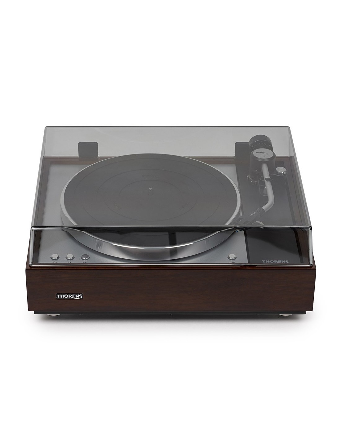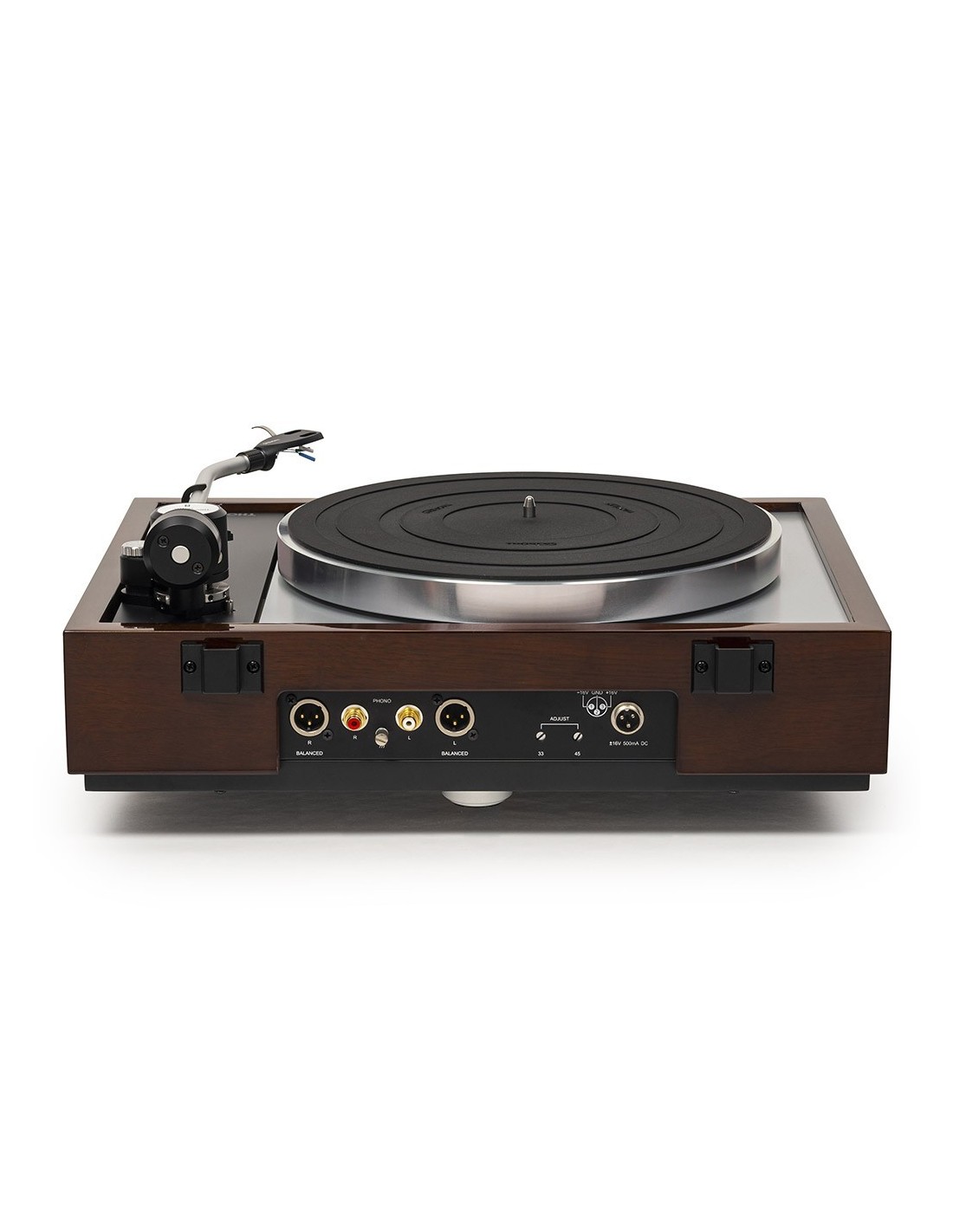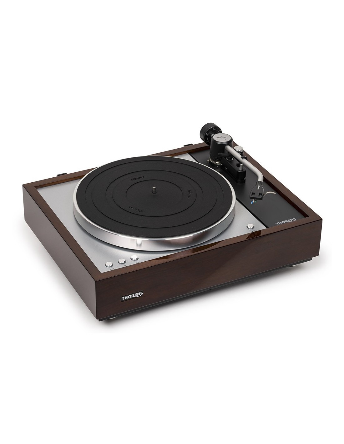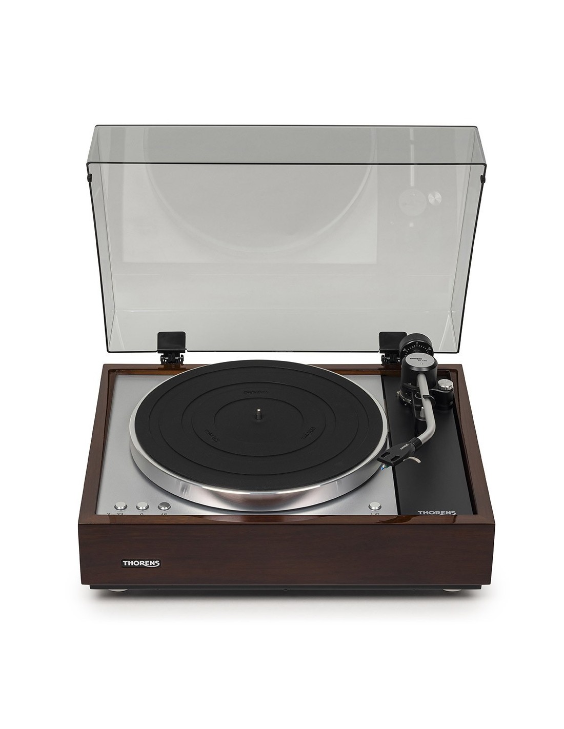 Giradischi a telaio sospeso flottante con trazione a cinghia, rivisitazione tecnologicamente perfezionata degli storici modelli Thorens TD 160 e TD 150 - braccio ultra preciso TP 160 a forma di J da 9 pollici sviluppato da Helmut Thiele, di massa effettiva 14 grammi, dotato di cuscinetti a lama di coltello stabilizzati orizzontalmente mediante magneti appositamente calibrati per garantire la massima accuratezza di tracciamento - headshell portatestina rimovibile con connettore SME (testina da acquistare separatamente) - alzabraccio elettrico con funzione di arresto automatico a fine corsa con sensore ottico - controtelaio stabilizzato su 3 molle coniche montate sulla base del giradischi - sistema calibrato con tirante in acciaio collegato ad un perno in acciaio ancorato alla base, in grado di prevenire le oscillazioni e consentire un movimento solo verticale al controtelaio - piatto in due parti dinamicamente bilanciato in lega d'alluminio lavorato a macchina - motore sincrono DC stabilizzato a controllo elettronico con unità di alimentazione lineare esterna ad altissime prestazioni TPN 1600 con trasformatore toroidale e tensione d'uscita da 2 x 16 VDC - cinghia interna a tensione regolabile - iconico plinto in legno - uscite bilanciate XLR e sbilanciate RCA - tappetino smorzante in gomma e cappa parapolvere in dotazione - finitura Walnut High Gloss (noce laccato) - dimensioni (L x A x P) 454 x 180 x 369 mm - peso 11 Kg