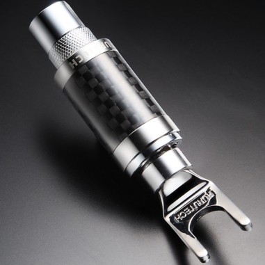 Terminazioni a forcella per cavi diffusori ad alte prestazioni - costruzione in rame purissimo trattato Alpha rodiato - sistema di fissaggio misto saldatura e crimpaggio (con viti) - utilizzabili con conduttori sino a 6 MM di diametro - apertura utile forcella 8,2 mm - set di 2 pezzi