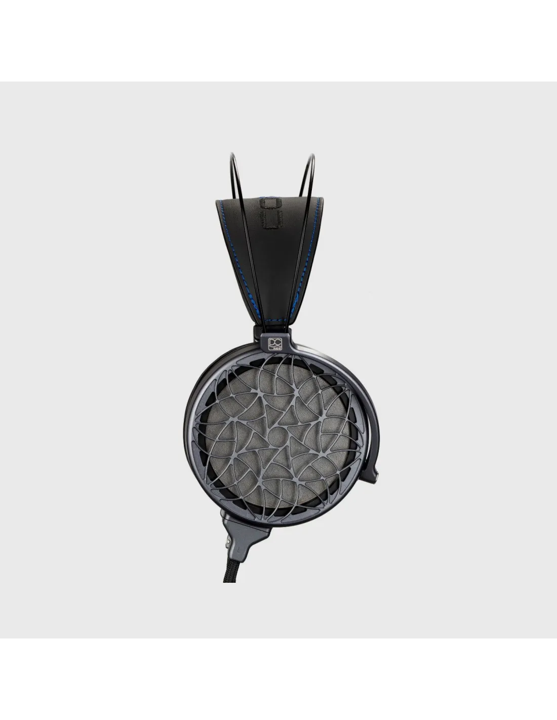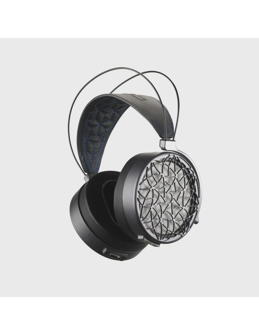 Cuffia elettrostatica di tipo aperto hi-end. Driver elettrostatici da 88mm per un'estensione in bassa frequenza fino a 6Hz completamente sigillati alla polvere e accoppiati in base alle caratteristiche (matched). Sistema AMTS (Acoustic Metamaterial Tuning System) a guida d'onda, per una risoluzione migliorata e per l'eliminazione delle onde stazionarie. Padiglioni in metallo con cuscinetti in pelle scamosciata. Archetto auto regolante. In dotazione cavo di lunghezza 2mt con capacità di 135pF. Peso: 465gr. In dotazione elegante custodia per il trasporto. Come tutte le cuffie elettrostatiche necessita di un amplificatore di pilotaggio appropriato con tensione di 580V. Con cavo standard da 2mt in dotazione.