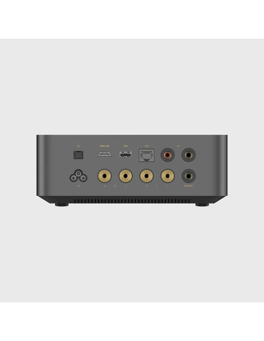 Il dispositivo presenta un chassis elegante in alluminio con finiture di alta qualità. Il design compatto e moderno permette di integrarlo facilmente in qualsiasi ambiente. Il frontale include pulsanti touch per comandi rapidi, mentre la disposizione interna ottimizza le prestazioni audio riducendo interferenze e rumore.